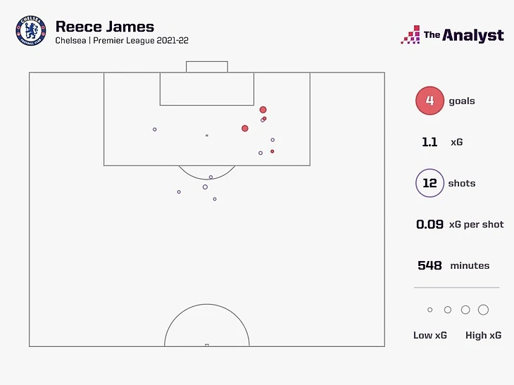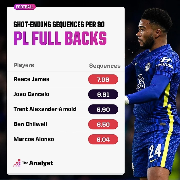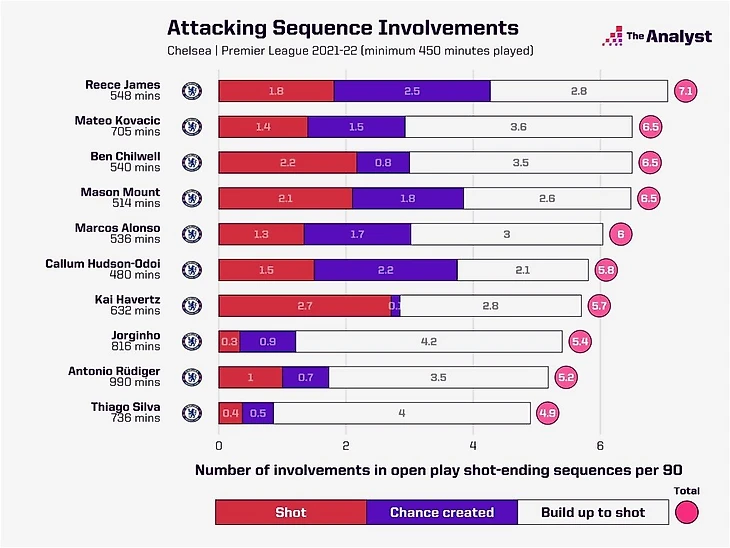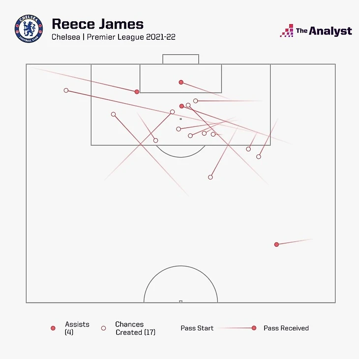 Джеймс занимает третье место после этой пары по количеству участий в действиях, приведших к удару (12 ударов и 17 созданных шансов), среди четырех защитников «Челси» в первой девятке — Антонио Рюдигер, также один из них, является единственным центральным защитником в этом списке.