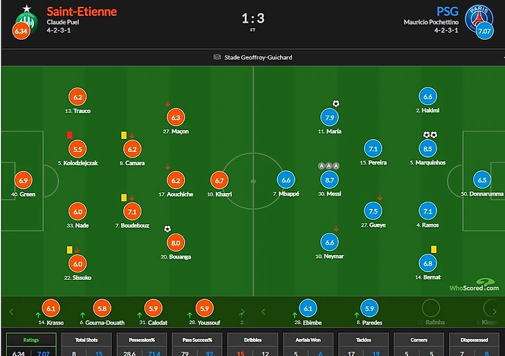 Счет открыли хозяева поля уже на 23й минуте, в концовке второго тайма был удален защитник «Сэнт-Этьена» Тимоте Колодзейчак, а в добавленное к первому тайму время Месси ассистировал Маркиньосу и помог «ПСЖ» сравнять счет.