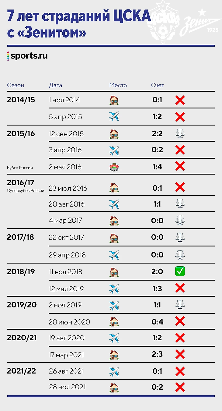 Уже 7 лет ЦСКА страдает против «Зенита»: всего 1 победа в 18 матчах. А сейчас 5 поражений подряд