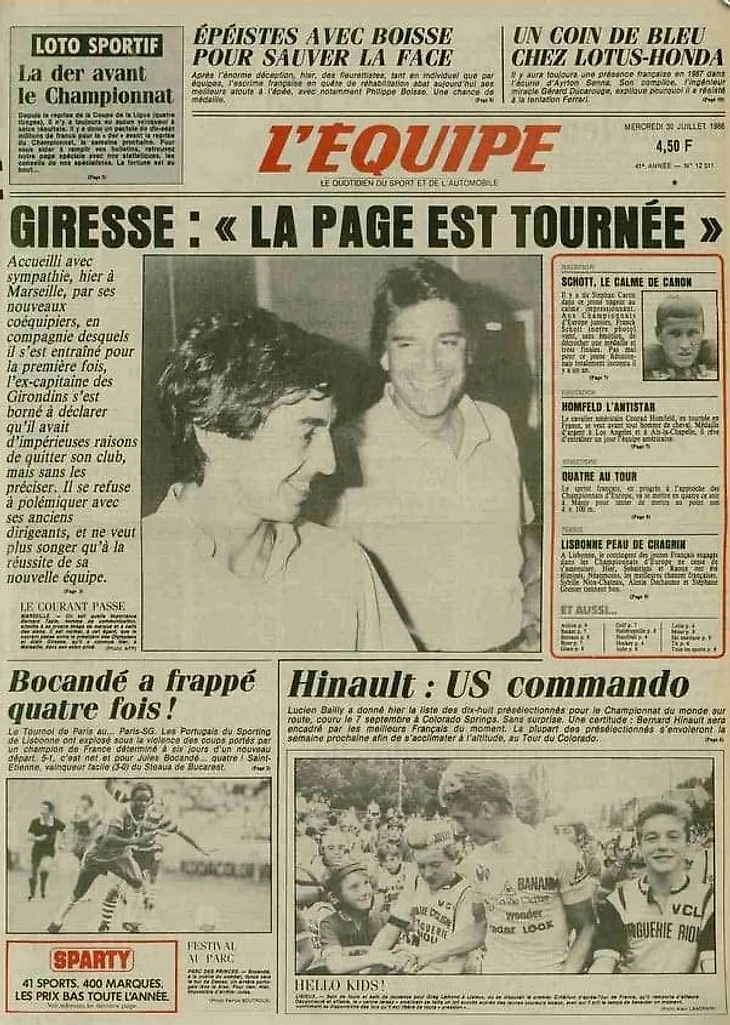 Газета L'Equipe от 30-го июля 1986 с подробностями перехода Жиресса в Марсель Бернара Тапи