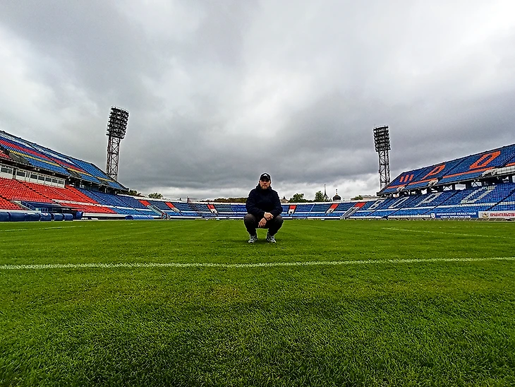 Тут неожиданно мой удивленный взор привлекла открытая калитка, ведущая к лестнице на Западную трибуну. Я проскользнул в неё. Поднимаясь по лестнице видел ещё одного парня сидящего на ступеньках. На самом верху я не встретил никаких преград и оказался в подтрибунке Запада, а после и на самой трибуне. Любуясь пустым стадионом я заметил, что в углу трибуны есть лесенка, спускающаяся прямо к беговым дорожкам. Я не мог поверить, «уж здесь то точно будет какой-нибудь забор» - думал я. Но нет, я оказался фактически на поле и начал жадно фотографировать все вокруг, «пока охрана меня не выгнала». Но охрана не появлялась. Я сфотографировал стадион, себя на фоне стадиона, ворота, себя в воротах, обошел вокруг поля и фотографировал всё. Прошелся по подтрибунным помещениям домашнего сектора. Меня ни кто не останавливал. Это было так удивительно... В наше время, время заборов, видеокамер, злых и тупых охранников. Ещё две недели назад я перелазил через забор на никому не нужный малюсенький стадион в Лазаревском, получив травмы и рискуя быть покусанным собакой или получить люлей от охранника-спортсмена, (подробности здесь), а теперь я гуляю по центральному стадиону города-миллионника и меня ни кто не гонит. Это было очень странно и приятно. Возможно все дело в том, что был праздничный день и смотреть за мной было некому. В любом случае, опять приведу сравнение с девушкой, ведь для меня ЦСП тоже стал своеобразной возлюбленной: это как встречаться с девушкой под присмотром ее отца, а потом неожиданно остаться наедине и с ней можно делать всё, что захочется.