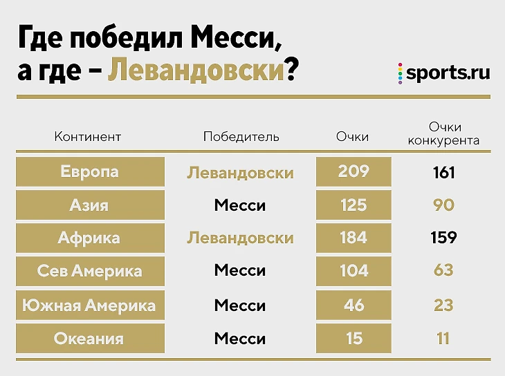 Неудивительно, что за Левандовского вступились во Франции, Испании, Германии и Италии. Потому что в европейском голосовании он победил с огромным отрывом: 209 очков и 22 первых места (из 52), а Месси даже не второй. Следом за поляком – Жоржиньо (166 очков и 11 первых мест), а потом Месси – 161 очко и 11 побед. Четвертое и пятое место в Европе с одинаковым количеством очков заняли Бензема и Канте.