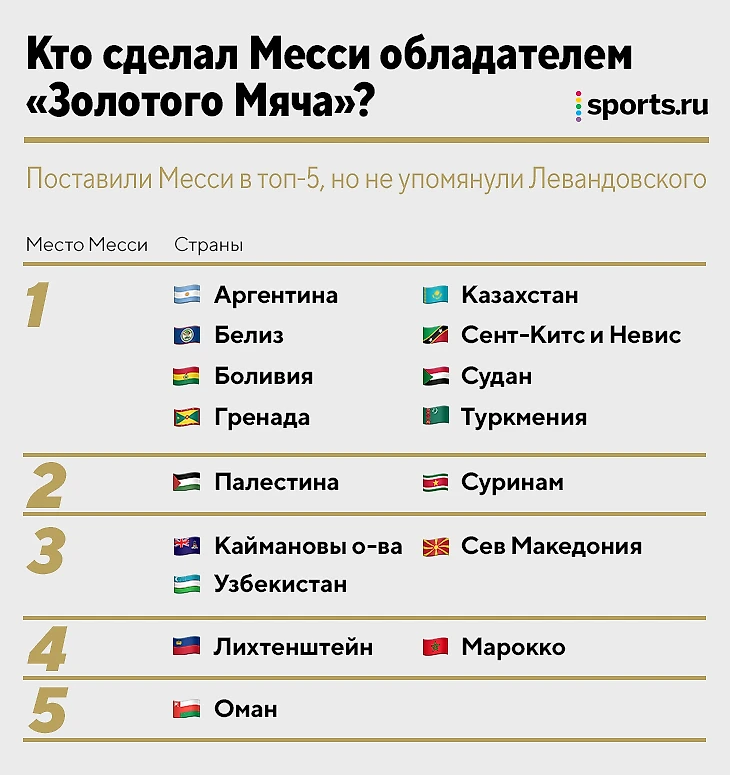 Правда, такая практика применялась и в сторону Роберта. Представители 14 стран поставили Левандовски в топ-5 и проигнорировали Месси.