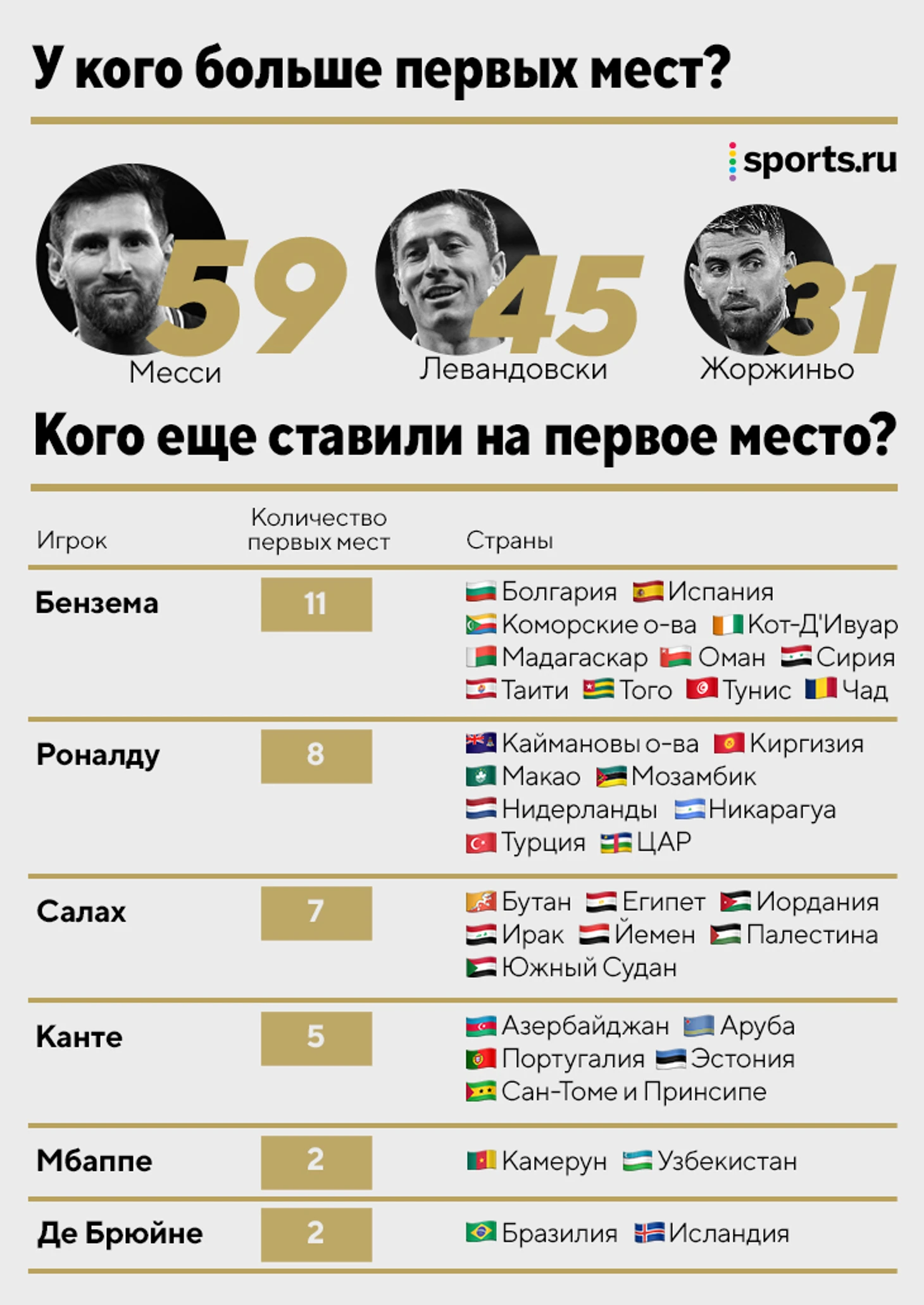 Кстати, не все страны отдавали первое место Месси или Левандовскому. На первое место также ставили Бензема, Роналду, Салаха, Канте, Мбаппе и Де Брюйне.