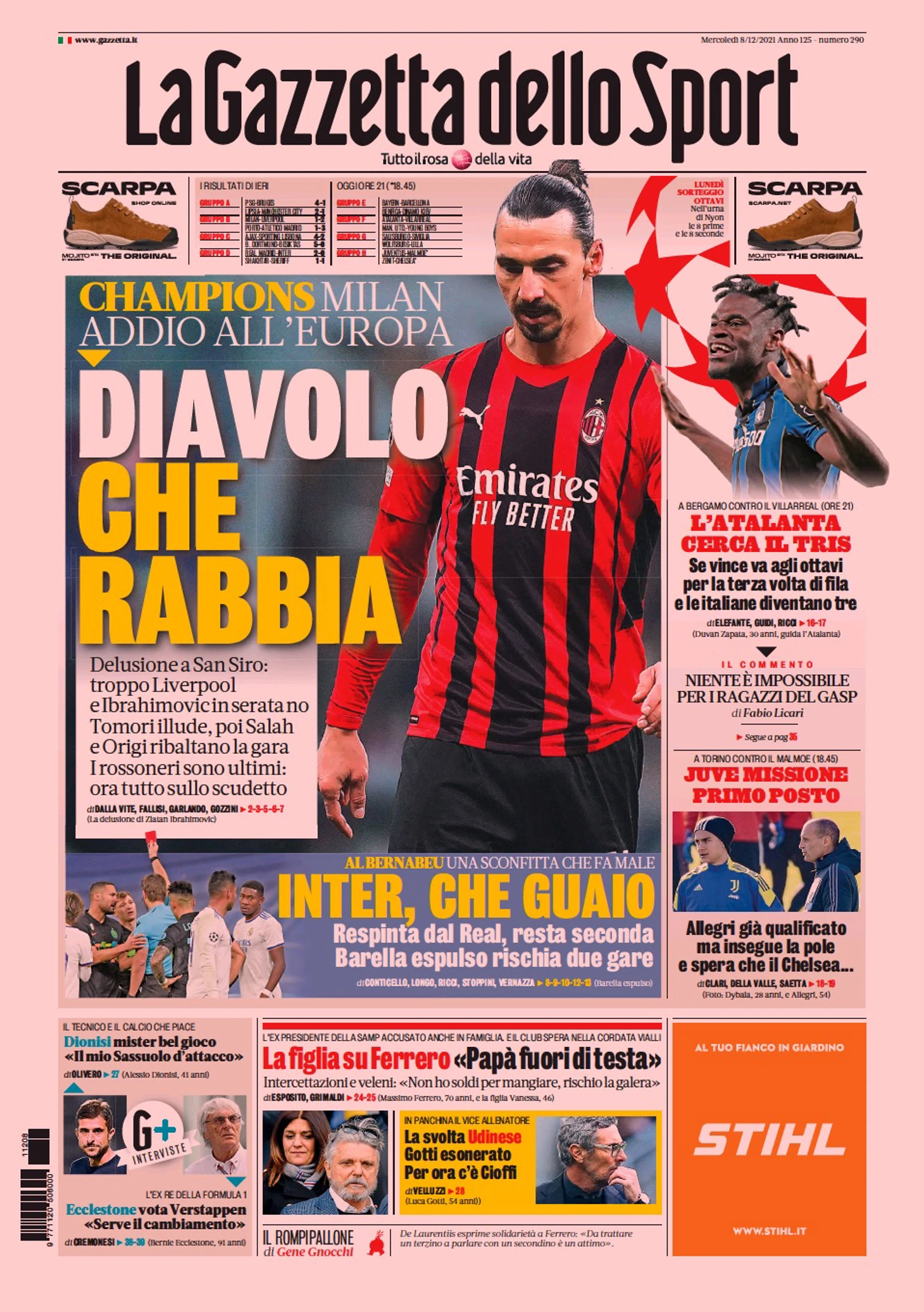 В день перед Ла Скалой, Пиоли и Индзаги побеждены в Лиге Чемпионов. Выиграл «Ливерпуль» (2:1), «Милан» вылетел из Европы. «Атлетико» в 1/8-финала. На «Сан Сиро» Россонери вышли вперёд благодаря Томори, затем обгон от «красных». «Интер» проиграл на «Бернабеу» (2:0): «Реал» Анчелотти празднует первое место. В Мадриде о результате позаботились Кроос и Модрич. «Аталанта» должна обыгрывать «Вильярреал», чтобы квалифицироваться. «Юве» с «Мальме»: надежда на первое место.