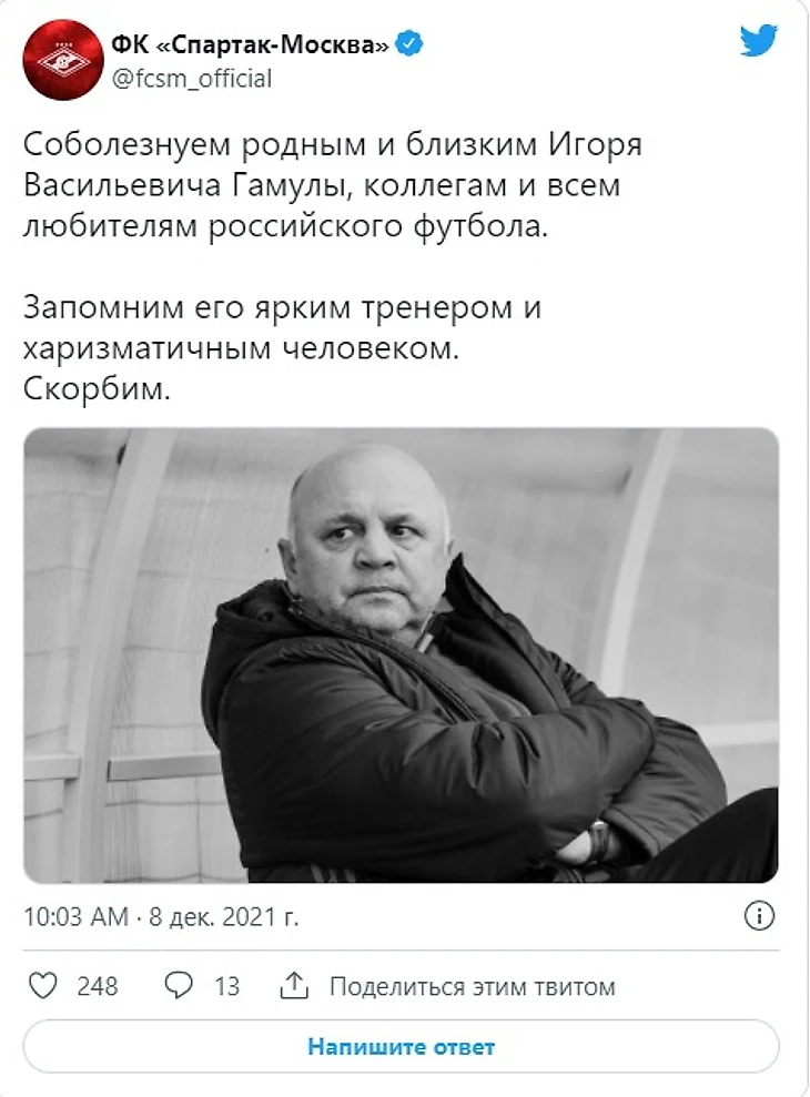 Спартак» через Twitter высказал соболезнования в связи со смертью экс-тренера «Ростова» Игоря Гамулы.