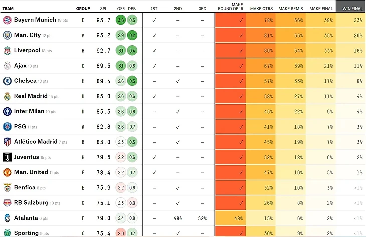 По данным суперкомпьютера FiveThirtyEight, вероятность выхода «Ювентуса» в полуфинал Лиги чемпионов составляет 18%, в то время как выход в финал представляется весьма маловероятным - всего 6%.