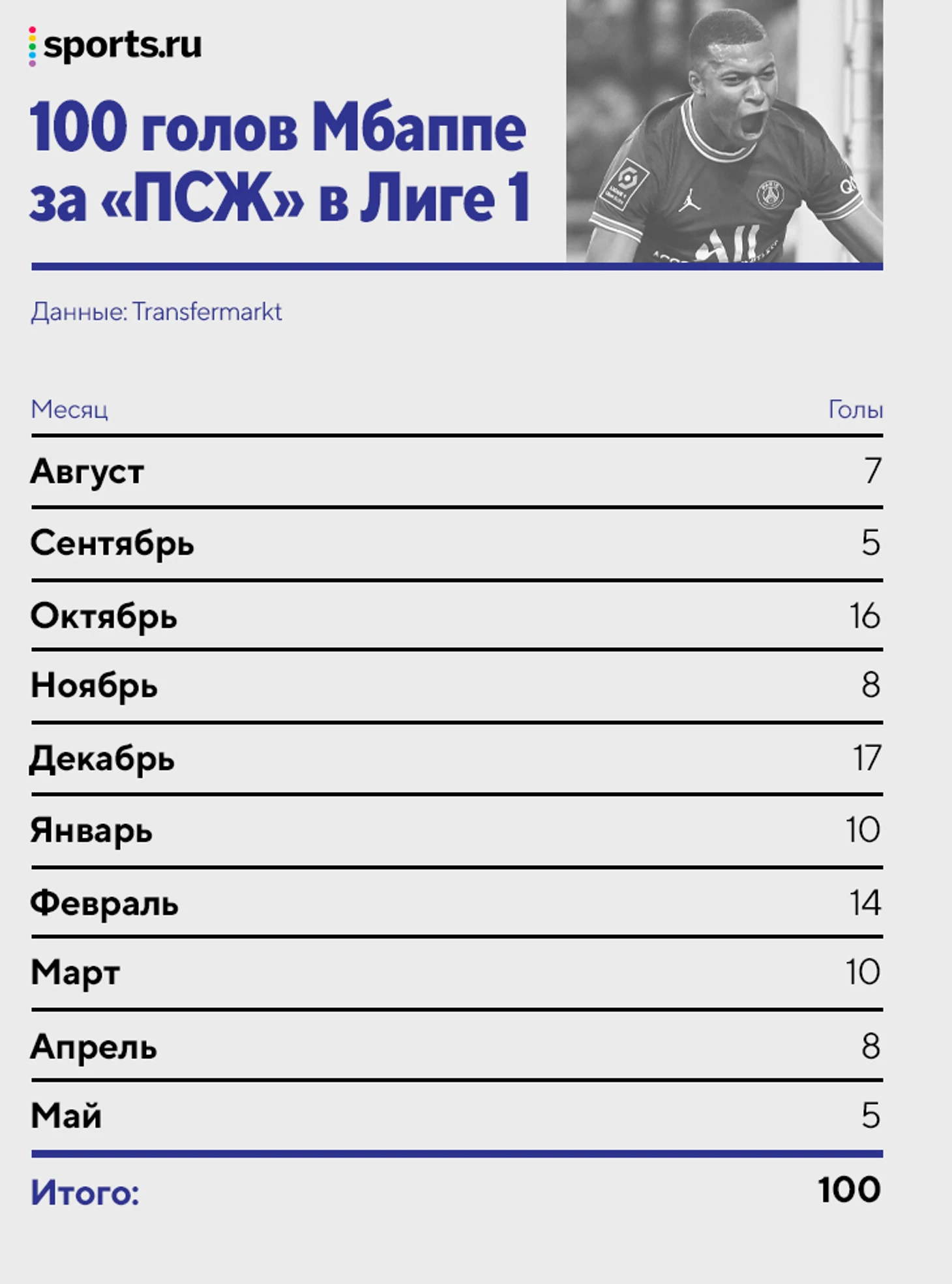 Символично, что именно в матче с бывшей командой Мбаппе дошел до 100 голов за «ПСЖ» в Лиге 1 – и это рекорд чемпионата. Француз стал самым молодым игроком (22 года и 357 дней), добравшимся до сотни голов за один клуб (еще 16 до этого положил за «Монако»).