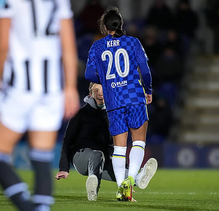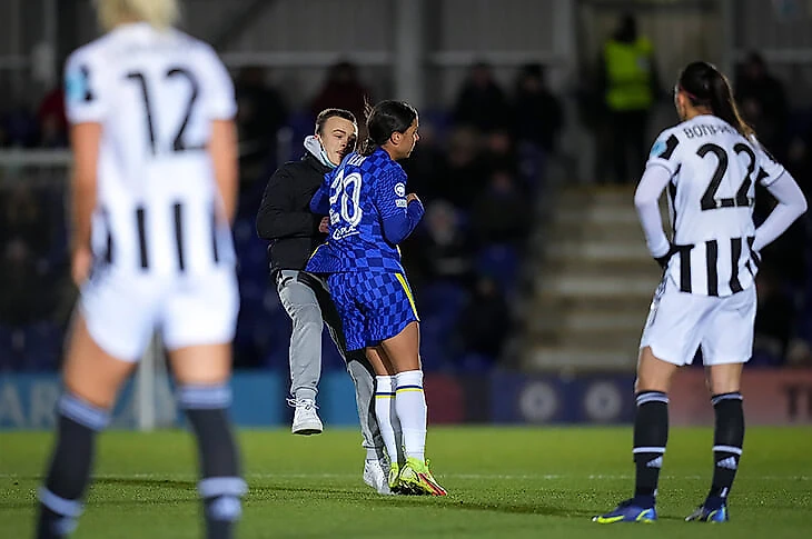 На прошлой неделе в матче женской Лиги чемпионов болельщик выбежал на поле – а форвард «Челси» Сэм Керр (на самом деле ее зовут Саманта, а это просто сокращение) была против.