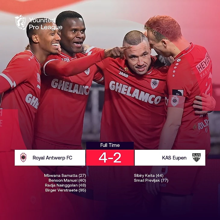 «Антверпен» контролировал игру примерно 70 минут и вел 3:1 – но вместо того чтобы спокойно довести дело до победы, занервничал и чуть не позволил «Эйпену» вернуться в игру. «Панды» напоследок бросились в атаку и сократили отставание до одного мяча. К счастью для «Антверпена», удалось отбиться, а потом поставить точку на пятой добавленной минуте. «Это был трудный матч, – говорит главный тренер «Антверпена» Бриан Приске. Я думаю, что мы действительно держали игру под контролем и заслужили победу, но вот второй тайм получился излишне захватывающим. После гола Наингголана мы немного выпустили из рук нити игры – так бывает. Конечно, я доволен тремя очками, но нам нужно продолжать усердно работать, потому что мы точно можем играть лучше».
