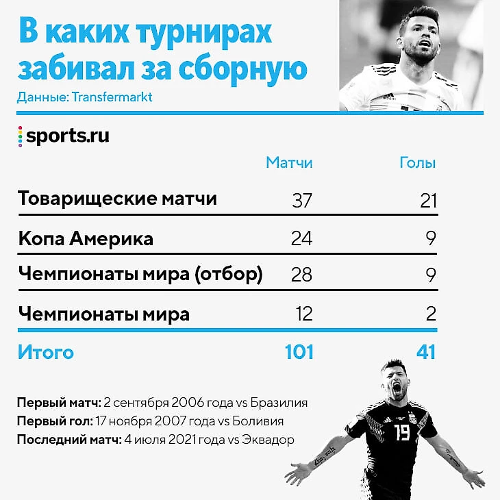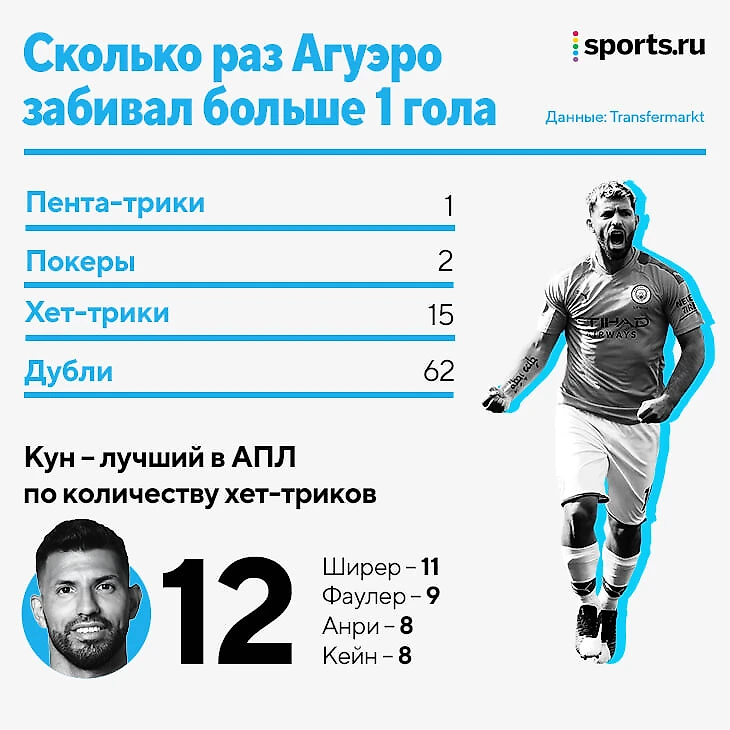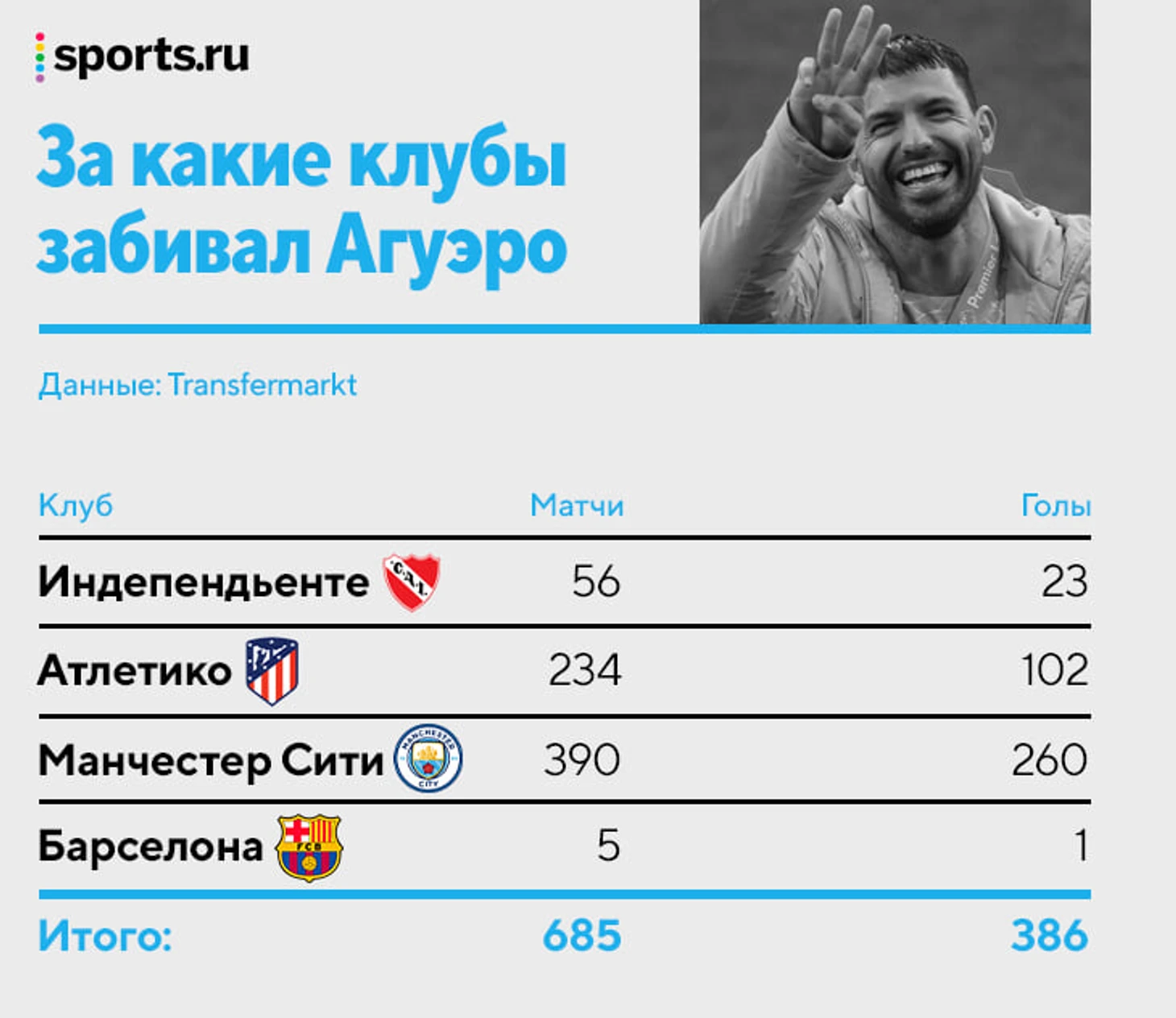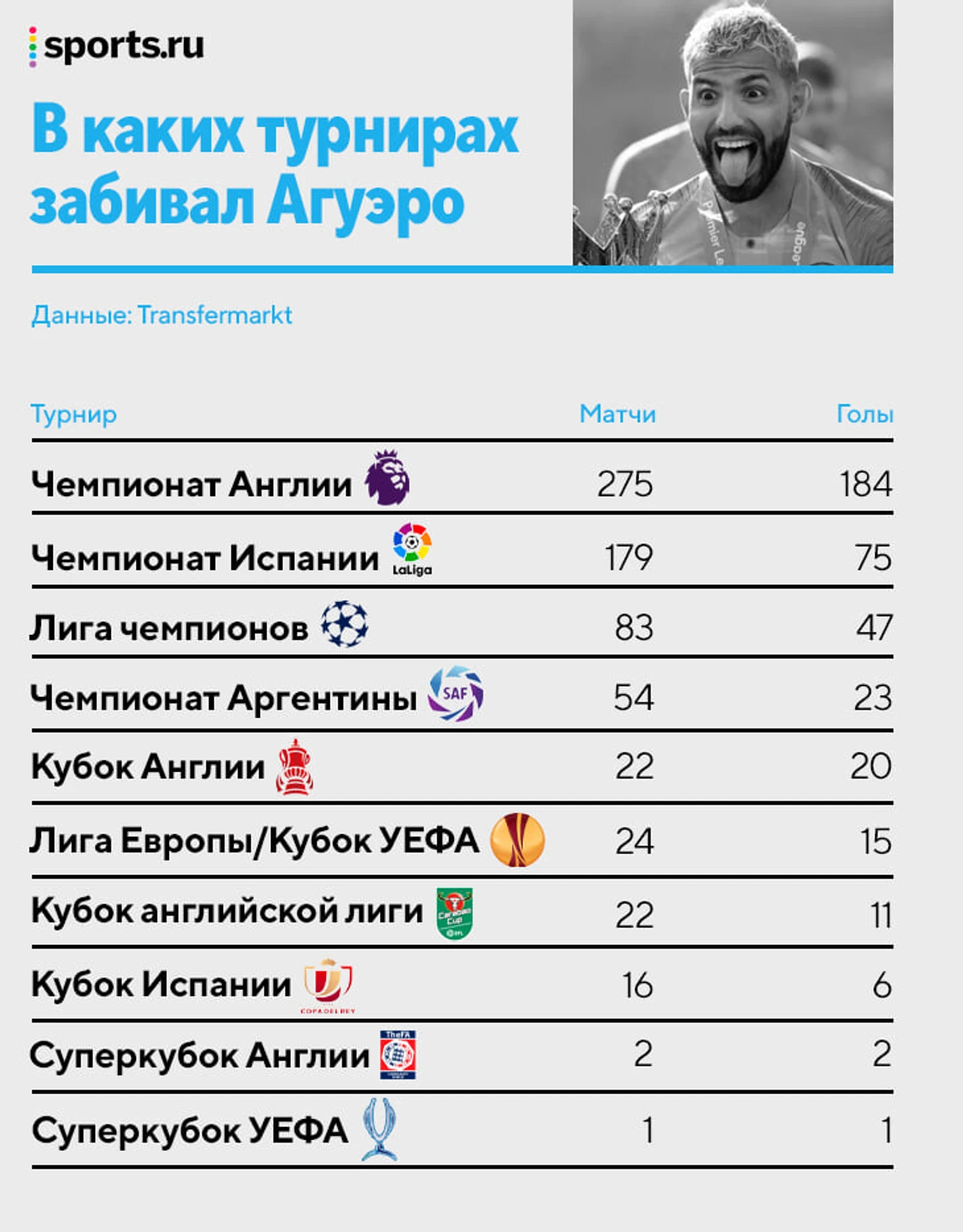Аргентинец бодрился и считал, что вернется, но тахикардия оказалась несовместима с профессиональной карьерой. В среду на специальной пресс-конференции Серхио объявил, что заканчивает. О важнейшем голе Агуэро в карьере почитайте здесь. А мы посчитали остальные мячи: кому, в каких турнирах и сколько он забивал.
