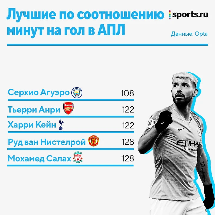 • Агуэро – рекордсмен АПЛ по голам за один клуб (184): в последнем матче обогнал Уэйна Руни.