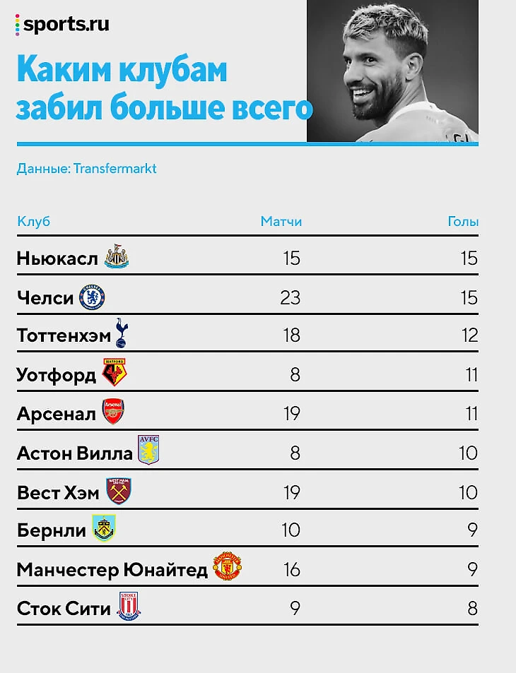 • Если считать клубы, то от Агуэро больше всего пострадали «Ньюкасл» (15 голов) и «Челси» (15).