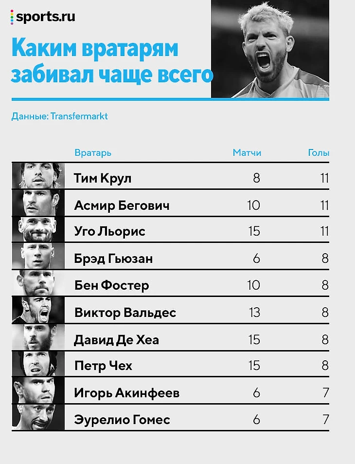 Агуэро – все. Посчитали, кому и сколько он забивал (Акинфеев в топ-10 любимых вратарей)