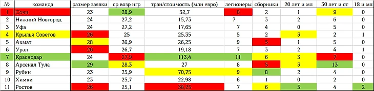 Победителем первенства провинциальных клубов РПЛ сезона 21/22 осенней части, становится Краснодар! Команда под руководством Виктора Гончаренко набирает 20 очков, тем самым делит первую строчку в турнирной таблице с Крыльями Советов. Но "быки" превосходят самый молодой коллектив нашего первенства, лишь по разнице забитых и пропущенных мячей. Забегая вперед, хочется сказать, что у коллектива из Самары очень прогрессивный состав, который по ходу сезона, по-моему мнению, будет только добавлять, за счет молодых игроков, наименьшего количества сборников (2), и наименьшего количества игроков 30 лет и старше.