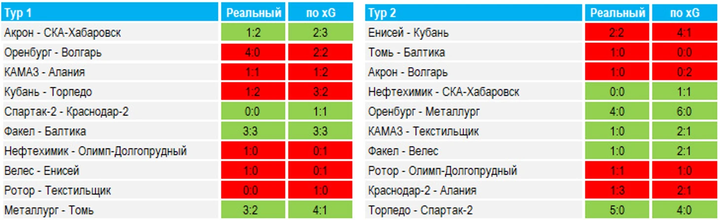 А теперь возьмём календарь 1-го и 2-го туров и сравним результаты состоявшихся матчей в реале и результаты матчей, если бы они завершались в строгом соответствии с теорией xG. В случае, когда исходы совпадают, подсветим их зелёным цветом, когда нет – красным.
