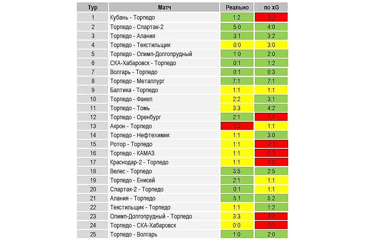 Именно тогда, в период с 14-го по 17-й тур «Торпедо» выдало серию из четырёх ничьих с одинаковым результатом 1:1. «Играем плохо, а в графе «поражения» до сих пор ноль», - говорили в октябре - ноябре болельщики чёрно-белых. Теория xG в этом смысле была более объективна и установила, что три из этих четырёх ничьих должны были обернуться проигрышами. Это матчи с «Ротором» в Волгограде, где должно было получиться по моментам и их остроте 1:2, дома с «КАМАЗом», где торпедовцы наиграли на поражение 0:1, и проваленный поединок в Краснодаре с фарм-клубом «быков», где по теории xG выходило поражение 0:2.