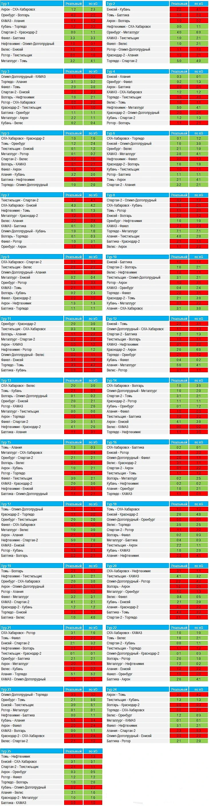 Ну, а теперь сравните итоги выступлений клубов ФНЛ в реале с тем, что получалось бы у них, если бы все игры завершались в точном соответствии с теорией «экспертных голов» - то есть xG. На что наиграли, то и заслужили. Еще раз: левая колонка - реальный счет, правая – счёт по xG. Если исходы совпали, то цвет будет зеленым, если нет, то красным. ну и конце еще разок продублируем альтернативную таблицу по xG после 25-ти туров.