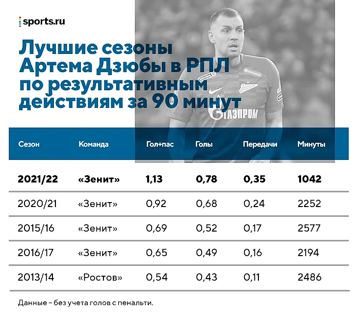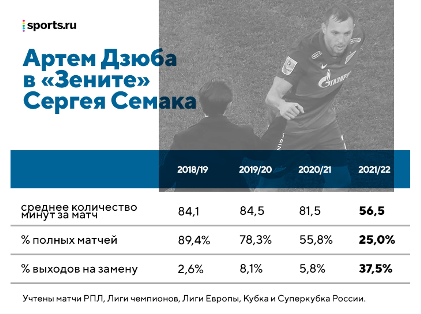 Изменения в стиле «Зенита» стали заметны осенью, а на старте сезона сам Дзюба находился в не очень хорошей форме. Это легко объяснимо: во-первых, по данным FIFPro, за последние три сезона Дзюба в летнее межсезонье отдыхал меньше всех в Европе, во-вторых, сказался и тяжелый эмоциональный фон после провала на Евро-2020.