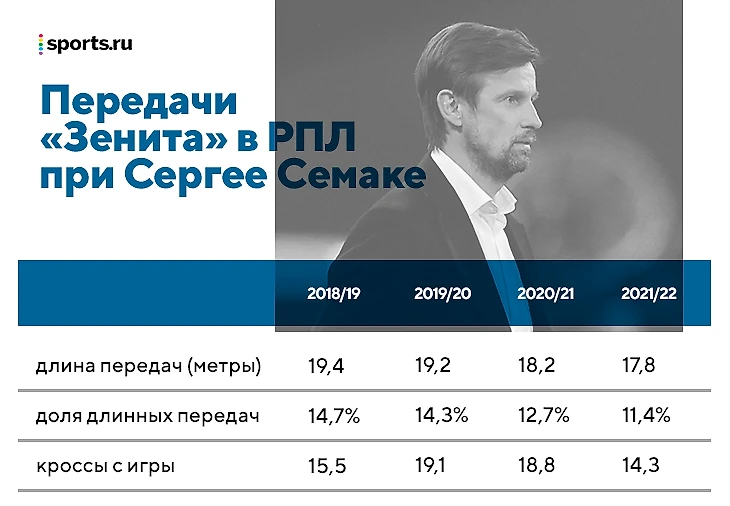 Более того, в этом сезоне петербуржцы занимают 16-е место в лиге по средней длине паса (17,8 метра). При Семаке «Зенит» еще никогда не имел таких показателей.