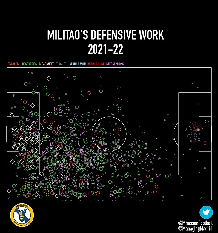 Милитао – второй по количеству отборов мяча, выносов и блоков в этом сезоне (после Каземиро). Он возглавляет список по количеству перехватов и выигранных воздушных дуэлей. На нем также было совершено большое количество фолов (второй после Винисиуса). Из молодого игрока, пытающегося найти себя в команде, Эдер превратился в одного из самых значимых футболистов стартового состава команды Анчелотти.