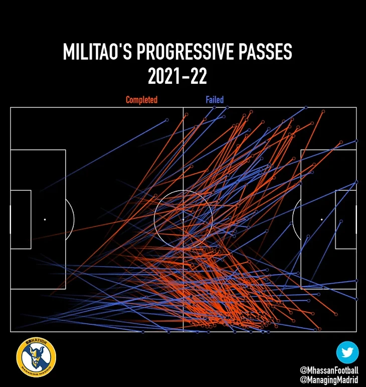 Хотя Милитао не так проницателен, как его партнер по обороне Алаба, он также вносит достаточно весомый вклад в вынос мяча из глубины поля. Его продвигающие атаку передачи и выносы в основном направлены на правый фланг. Бразилец играет на позиции правого центрального защитника в «Мадриде», в отличие от Рамоса, который обычно действовал слева. Тем не менее, Эдер хорошо справляется с диагональными передачами в направлении расположившихся выше игроков на правом фланге.
