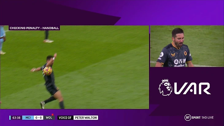 В том же матче против «Вулверхэмптона» возник не менее забавный случай. На 62 минуте встречи после навеса с правого фланга мяч попал в подмышку полузащитника гостей Жоау Моутинью. Арбитр посмотрел повтор, расценил это как игру рукой и поставил пенальти, который и принес «Сити» победу в том непростом матче.