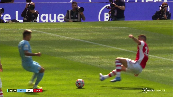 3) Ко второй желтой карточке Габриэла Мегальеса вопросов нет, но вы только взгляните, за что защитник получил свое первое предупреждение двумя минутами ранее – за то, что влетел в арбитра после толчка от Родри, который расчищал Рияду Марезу пространство для пробития пенальти. Атуэлл подумал, что Мегальес влетел в него специально и совершил ошибку, которая сыграет ключевую роль в дальнейшем развитии матча.