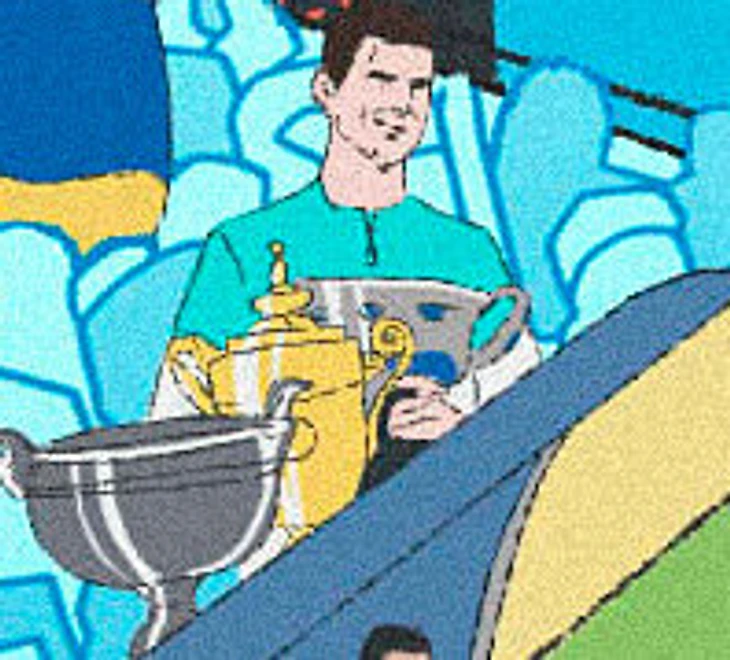 • На трибуне стоит Новак Джокович с трофеями Australian Open, «Ролан Гаррос» и «Уимблдона». Отличный улов, Новак!