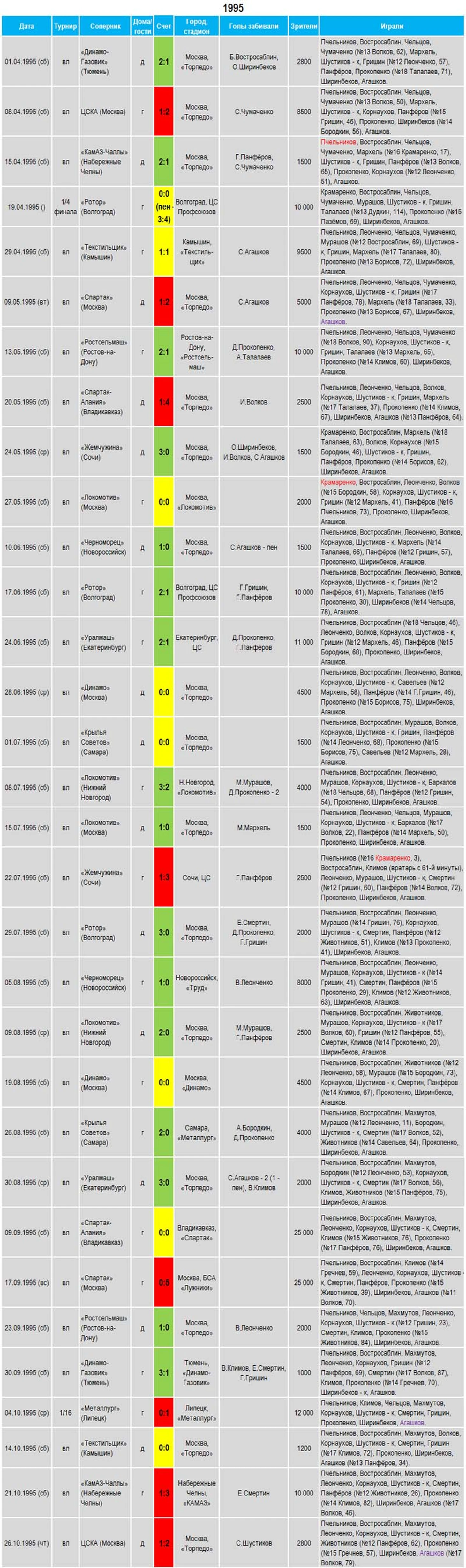После неудачного сезона-1994, год спустя «Торпедо» сумело поправить свои турнирные дела, заняв в таблице пятую позицию и получив путёвку в Кубок УЕФА. Правда, нужно отметить, что дистанция между «автозаводцами» и финишировавшими в призовой т ройке московскими спартаковцами составила очень много - 8 очков. От ставшего же чемпионом «Спартака-Алании» чёрно-белых отделили и вовсе 16 очков.