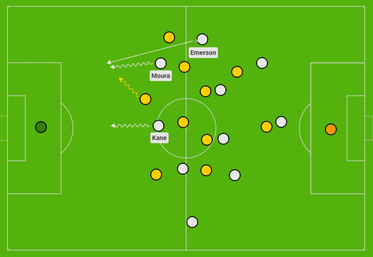 Эта тактика может быть эффективно использована для отвлечения соперника на левый фланг, где затем следует перевод на правый. Там уже, без опеки, Эмерсон Ройал будет пытаться комбинировать вместе с Моурой. После продвижения на половину поля соперника Бен Дэвис или Давинсон Санчес нередко продолжают движение вперед либо через опорную зону, либо через своего флангового защитника.