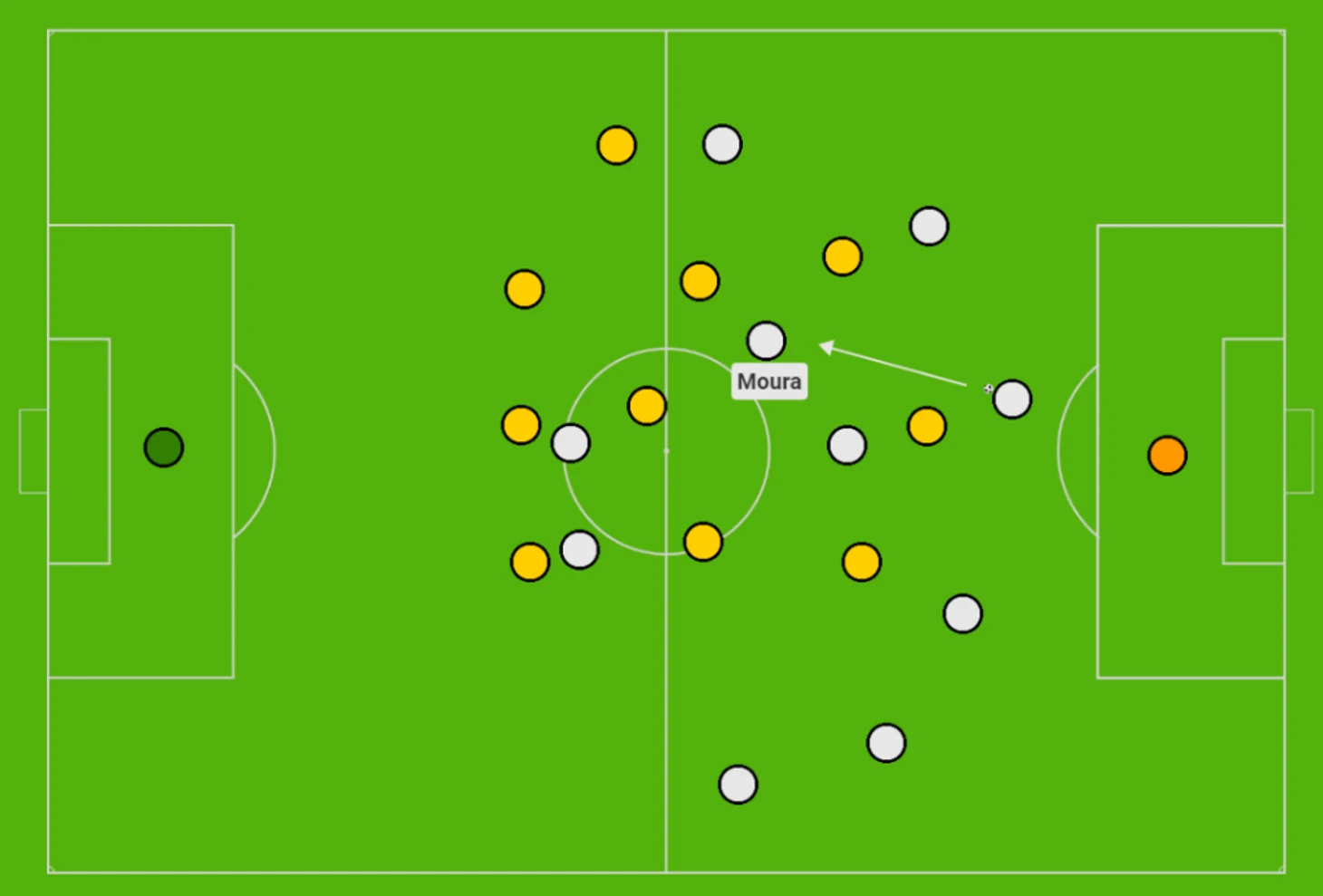 При Моуриньо Харри Кейн часто опускался в полузащиту, чтобы получить мяч. Но Конте отказался от этого, приберегая энергию Кейна на потом, и теперь он играет ближе к воротам. Моура взял на себя эту задачу, что очень подходит для быстрого и ловкого игрока. При этом он создает больше пространства для Скиппа и Хёйберга для перевода игры слева направо, так как соперники следуют за Моурой и игнорируют Эмерсона.