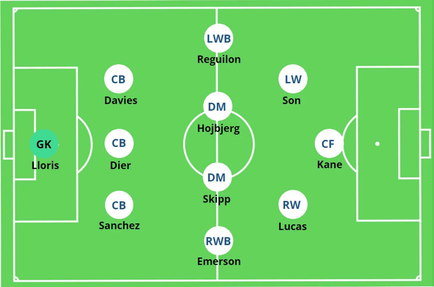 Команда Антонио Конте играет в 3 центральных защитника. Время от времени Пьер-Эмиль Хёйберг опускается на место левого ЦЗ, в то время как Бен Дэвис, по совместительству левый центральный защитник, поднимается выше. Обычно это движение происходит ближе к центру, так как "шпоры" стремятся перегрузить левый фланг и сыграть на таких игроков, как Регилон и Сон, чтобы они комбинировали.
