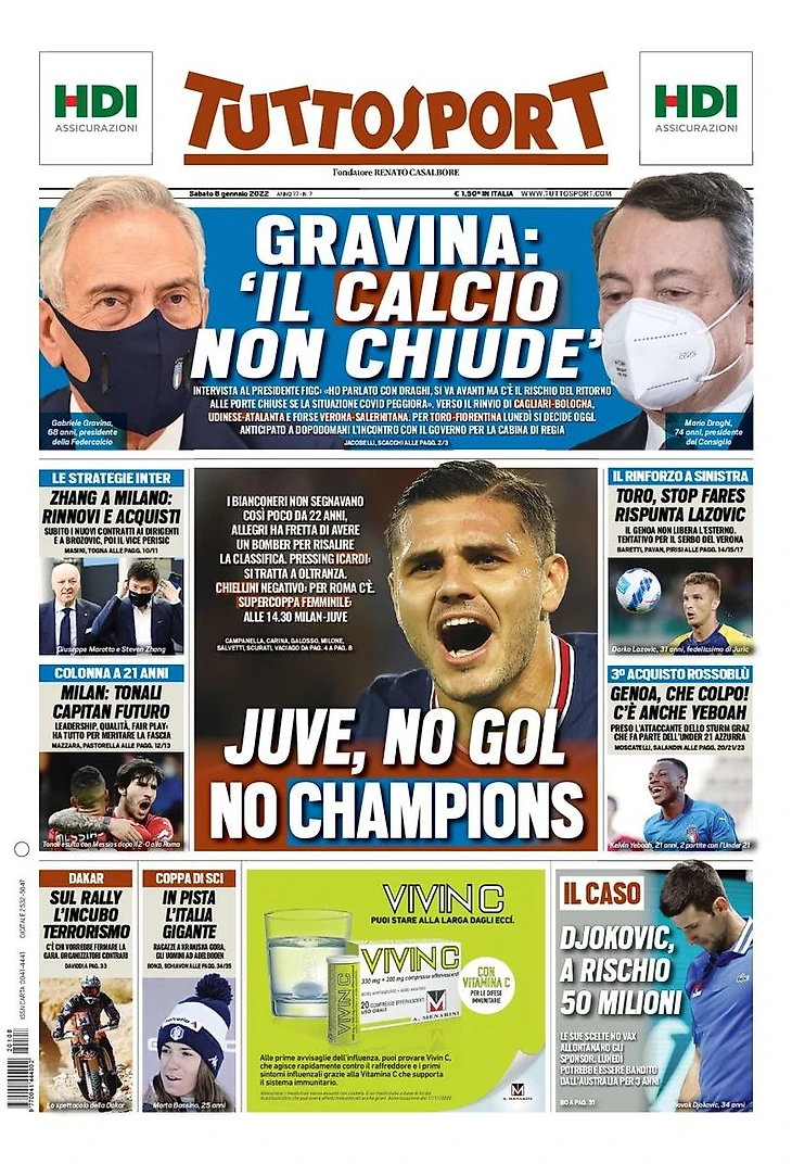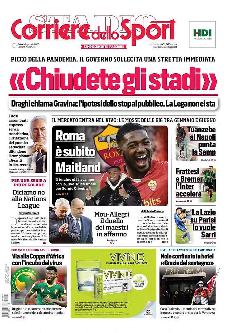 «Закройте стадионы» – такую пугающую цитату вывела в заголовок Corriere. «Пик пандемии, правительство призывает к немедленному ужесточению мер. Драги звонит Гравине: гипотеза закрытия публики. Лига не поддерживает это. Болельщики кучкуются и часто находятся без масок, раздражён Премьер-министр. Клубы защищают чемпионат: «Вперёд с уверенностью».