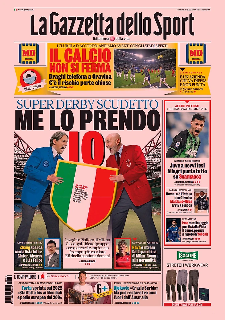 «Это возьму я» – таким заголовком Gazzetta обозначает борьбу «Интера» и «Милана» за титул: «Супер Дерби Скудетто. Индзаги и Пиоли – золото Милана. Игра, голы и командная идея: вот почему чемпионат всё более остаётся за ними. И дуэль продолжится завтра».