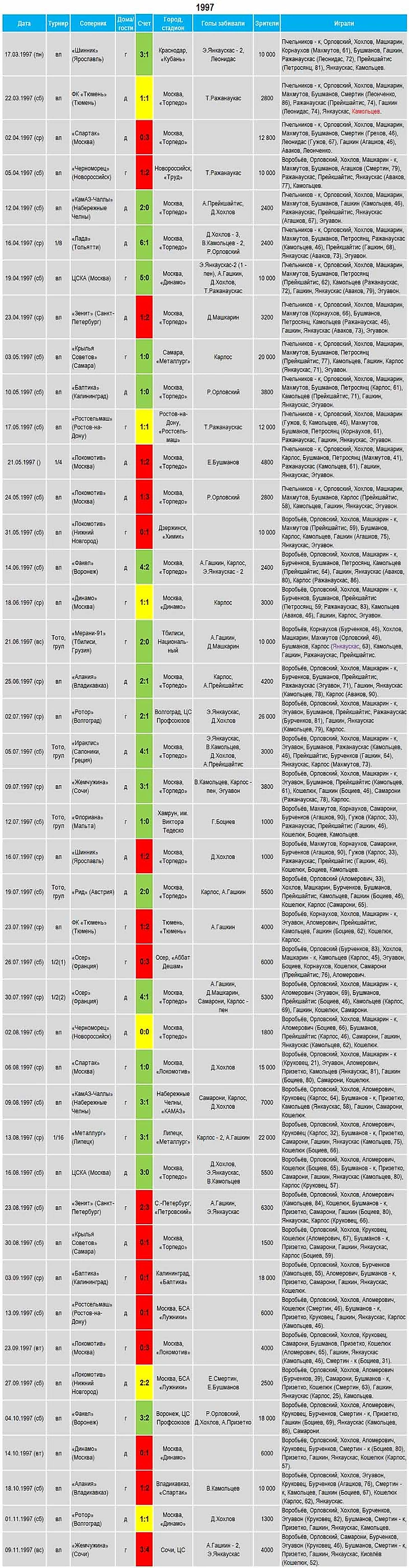 Таким образом, в зимнюю паузу между чемпионатами России 1996 и 1997 годов ряды «автозаводского» клуба пополнили 7 бывших «армецев». Среди них были защитники Евгений Бушманов, Денис Машкарин, хавбеки Андрей Гашкин, Дмитрий Хохлов, Леандро Самарони, Леонидас, нападающий Эдгарас Янкаускас. Команда неплохо стартовала, но, вынужденная играть в июле на международной арене в Кубке Интертото и проводить по два матча в неделю, к осени угодила в физиологическую яму, из которой так и нее выбралась, заняв итоговое 11-е место и формально приподнявшись лишь на одну строку выше. Зато, начав играть в более атакующий футбол, «Торпедо» установило свой новый рекорд в российском футболе, забив 50 мячей. Его оно побило лишь в сезоне-2001.