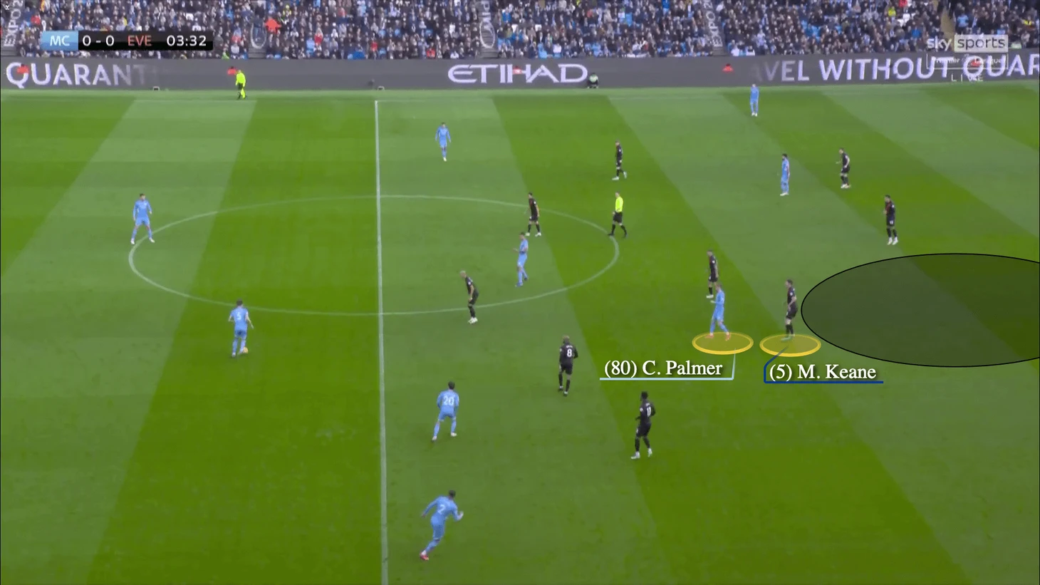 Но с начала второго тайма мы видим, что Палмер остается в высокой позиции, не опускается, сковывает ЦЗ соперника и угрожает рывками за спину.