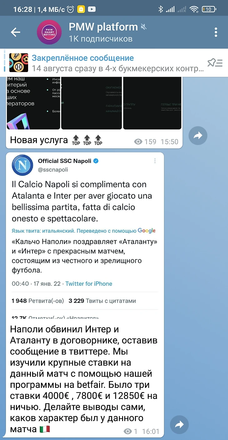 Перевод : " Наполи поздравляет Интер и Аталанту с прекрасным матчем, состоящим из честной и зрелещной игры "