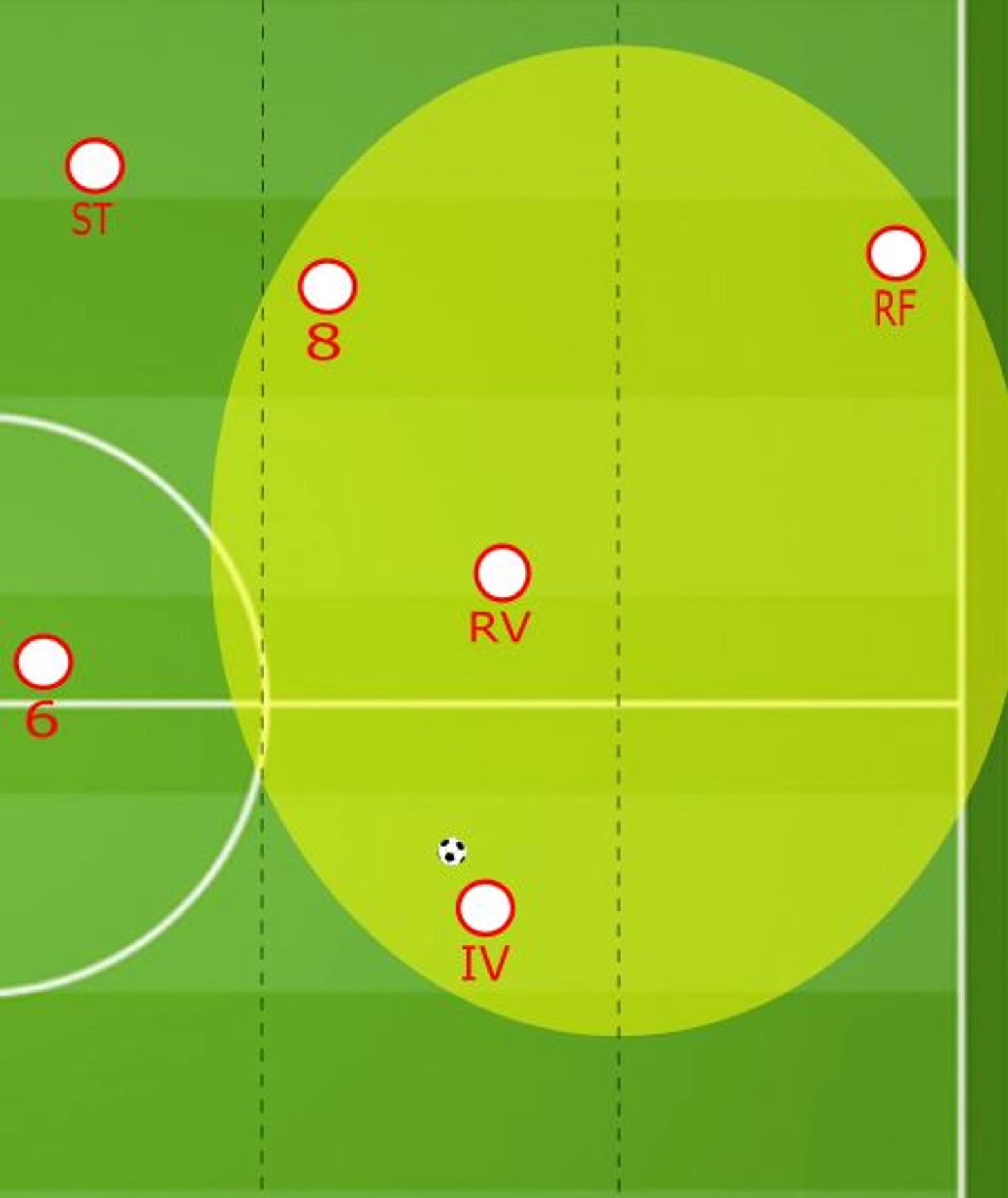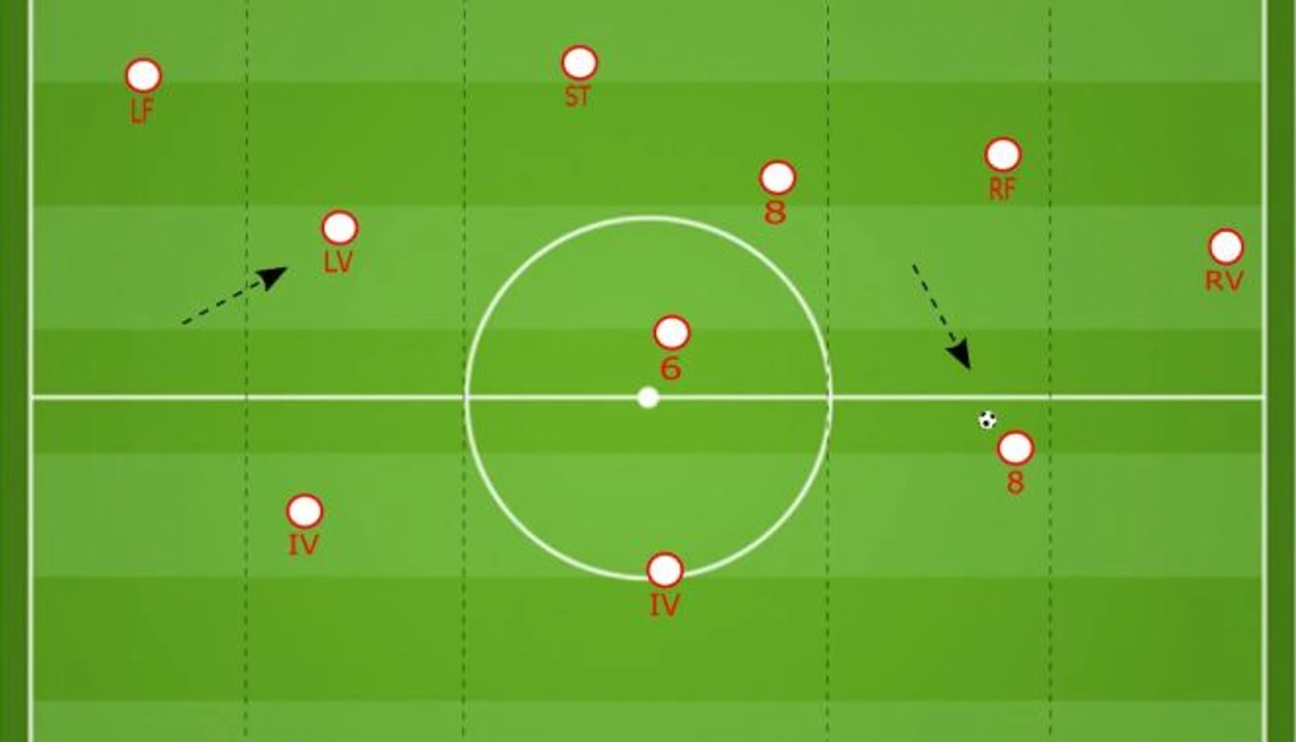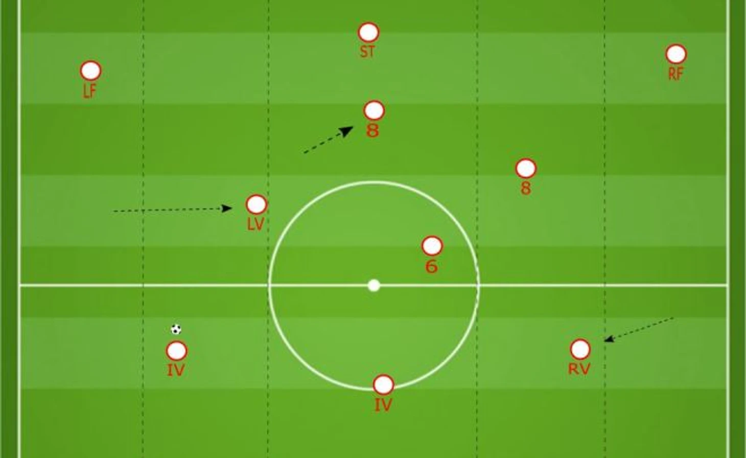 Несколько лет назад практически все команды использовали эту ротацию для создания тройки сзади. Шестерка опускается, и фуллбэки получают возможность подниматься. Если мы хотим обеспечить присутствие на флангах, центральные защитники могут располагаться широко вне зависимости от числа прессингующих в верхней линии соперника.