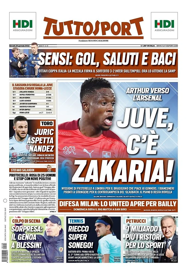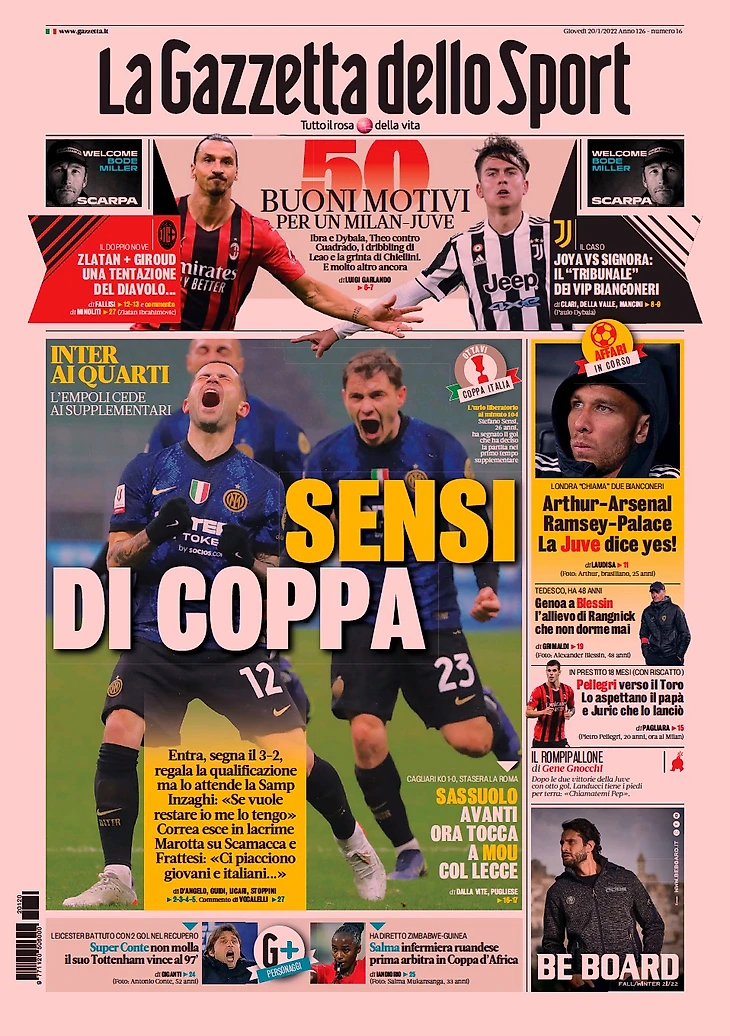 Gazzetta также выдала в заголовке каламбур с фамилией Сенси: «Чувства Кубка». «Интер» в четвертьфинале, «Эмполи» сдался в дополнительное время. Вышел, забил 3:2, но его ждёт «Самп». Индзаги: «Если хочешь – оставайся». Корреа ушёл в слезах. Маротта нацелен на Скамакку и Фраттези: «Нам нравятся молодые и итальянцы…».