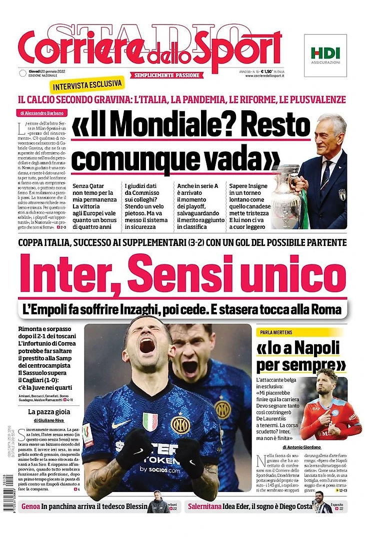 Одной из главных тем Corriere стало большое интервью с президентом итальянской федерации футбола Гравиной с заголовком «Мундиаль? Останусь, что бы ни случилось». «Футбол по Гравине: Италия, пандемия, реформы, плюсваленца. «Я не опасаюсь за свой пост без Катара. Победа на Евро ценна в качестве бонуса за четыре года. Суждения Коммиссо о коллегах? Я милосерден. Но нужно поставить систему в уверенное положение. Даже в Серии А настал момент плей-офф, это сохранение достижений, полученных в таблице. Знание об Инсинье, принимающем участие в таком далёком турнире, как канадский, доставляет печаль. И он отправляется туда не с лёгким сердцем».