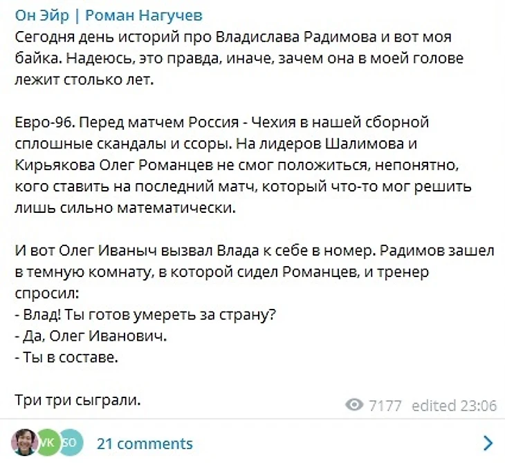 Несколько дней назад в телеграм-каналах негласно был объявлен вечер Владислава Радимова. Журналисты, блогеры и прочие ютуберы делились историями взаимодействий с бывшим капитаном «Зенита», а к концу дня к ним в комментарии пришел и сам Радимов.