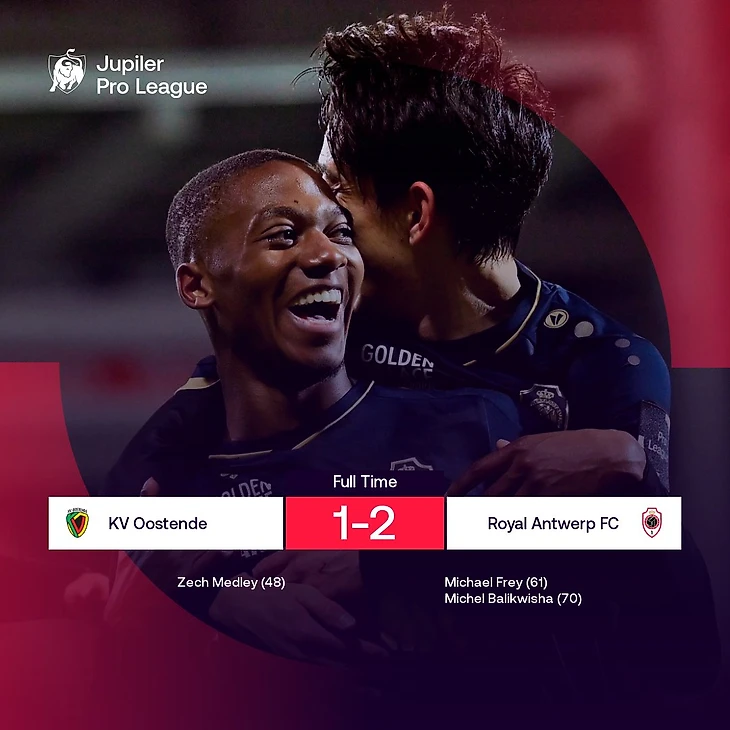Выдержав стартовый натиск «Антверпена», «Остенде» перехватил инициативу и еще незадолго до перерыва открыл счет, но гол Ндики отменили из-за офсайда. Зато в начале второго тайма совершенно законно забил Медли. Гости разозлились, снова включились в игру и перевернули ее за девять минут. Удачным решением Приске оказалась замена малозаметного Юссуфа на Миеси: японец сразу оживил атаку, а в эпизоде с решающим голом ассистировал Баликвише. «Думаю, что мы сами усложнили себе задачу, – считает полузащитник «Антверпена» Раджа Наингголан. – В первом тайме должны были забивать два или три. А когда проигрываешь 0:1 сопернику с характером, становится трудно. Раз мы выиграли, значит, здорово отреагировали как команда. Если оценивать все 90 минут, то мы заслужили победу». Такого же мнения придерживается главный тренер «Антверпена» Бриан Приске: «С «Остенде» всегда сложно играть, потому что это действительно хорошая команда с атакующими способностями, так что я горжусь своими игроками».