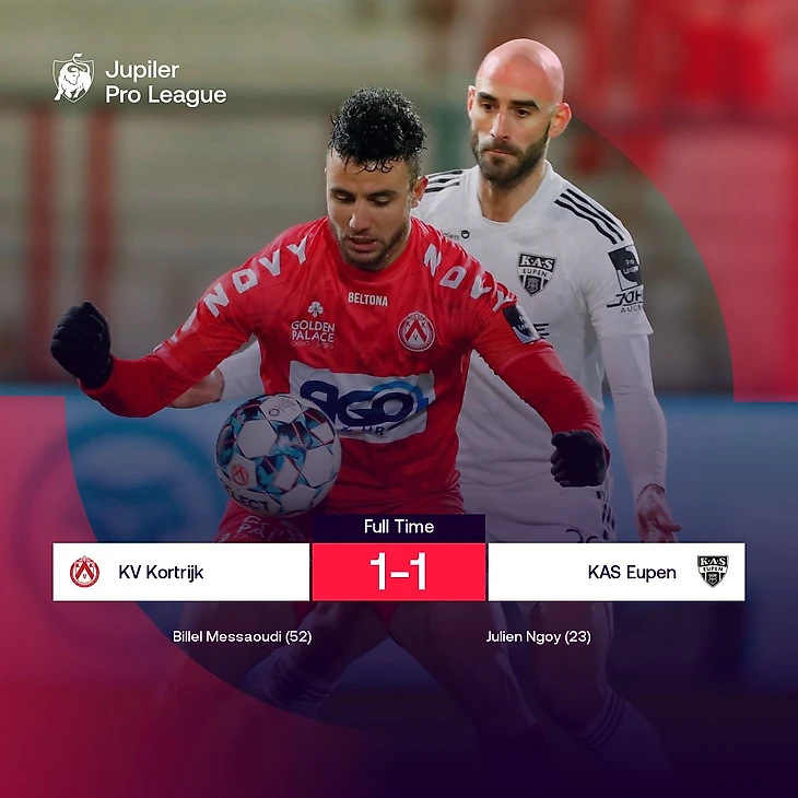 «Кортрейк» почти весь матч ожидаемо превосходил «Эйпен» по игре. Ожидаемо – потому что «панды» в последнее время сильно пострадали от коронавируса. В начале матча хозяева доминировали и несколько раз были близки к голу – особенно когда Морено зарядил в перекладину. Тем не менее, именно гости вышли вперед в матче. Нгой сотворил шедевр: получив мяч в штрафной, одним ловким движением избавился сразу от трех соперников и поразил нижний угол. С другой стороны – ну кто так обороняется? В самом начале второго тайма у Превляка был отличный шанс удвоить преимущество «Эйпена», но Смаил не смог обработать мяч на линии вратарской. А оплошность оказалась очень дорогой, потому что «Кортрейк» вскоре отыгрался. Игроки «Эйпена» недоработали в нескольких зонах, Мессауди выцарапал мяч и из-за пределов штрафной уложил его под дальнюю штангу. Здесь Химмельманн не справился, зато уже в добавленное время спас команду от поражения после удара Кадри. «Эйпен» может быть доволен результатом, хоть и вел в счете.