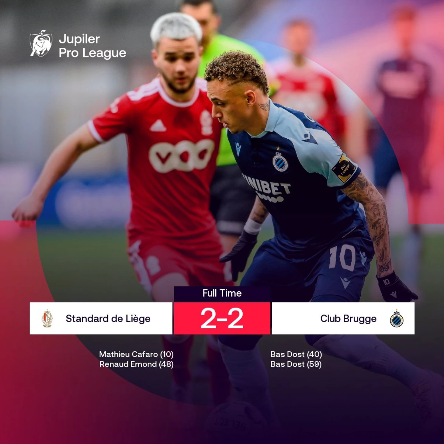 Афиша полностью оправдала ожидания. На 8-й минуте Ланг открыл счет после изящной стеночки с Достом, но гол отменили из-за офсайда. А уже через две минуты забил «Стандард» – и по правилам. Отличился новичок Кафаро. После этого «Брюгге» тотально доминировал до конца тайма и бил, бил, бил: Нсоки попал в штангу, а Лангу, Вормеру и Ванакену не позволил забить Бодар. Но гости все-таки отыгрались до перерыва: Дост перевисел Лайфиса и замкнул подачу Ванакена. И все же «Стандард», почти не имея моментов, снова вышел вперед в самом начале второго тайма. Эмон забил первый гол после возвращения любимому сопернику: у него 8+3 в 18 матчах против «Брюгге». Как и в случае с первым таймом, после пропущенного гола гости снова полчаса полностью контролировали игру и сравняли счет – а потом случилось удаление Хендри за фол последней надежды (Джек пропустит один матч). «Стандард» почуял кровь и помчался вперед. Все могло решиться в добавленное время, но Мата героически подставился под мощный удар Нкунку и головой выбил мяч с ленточки. Огонь!