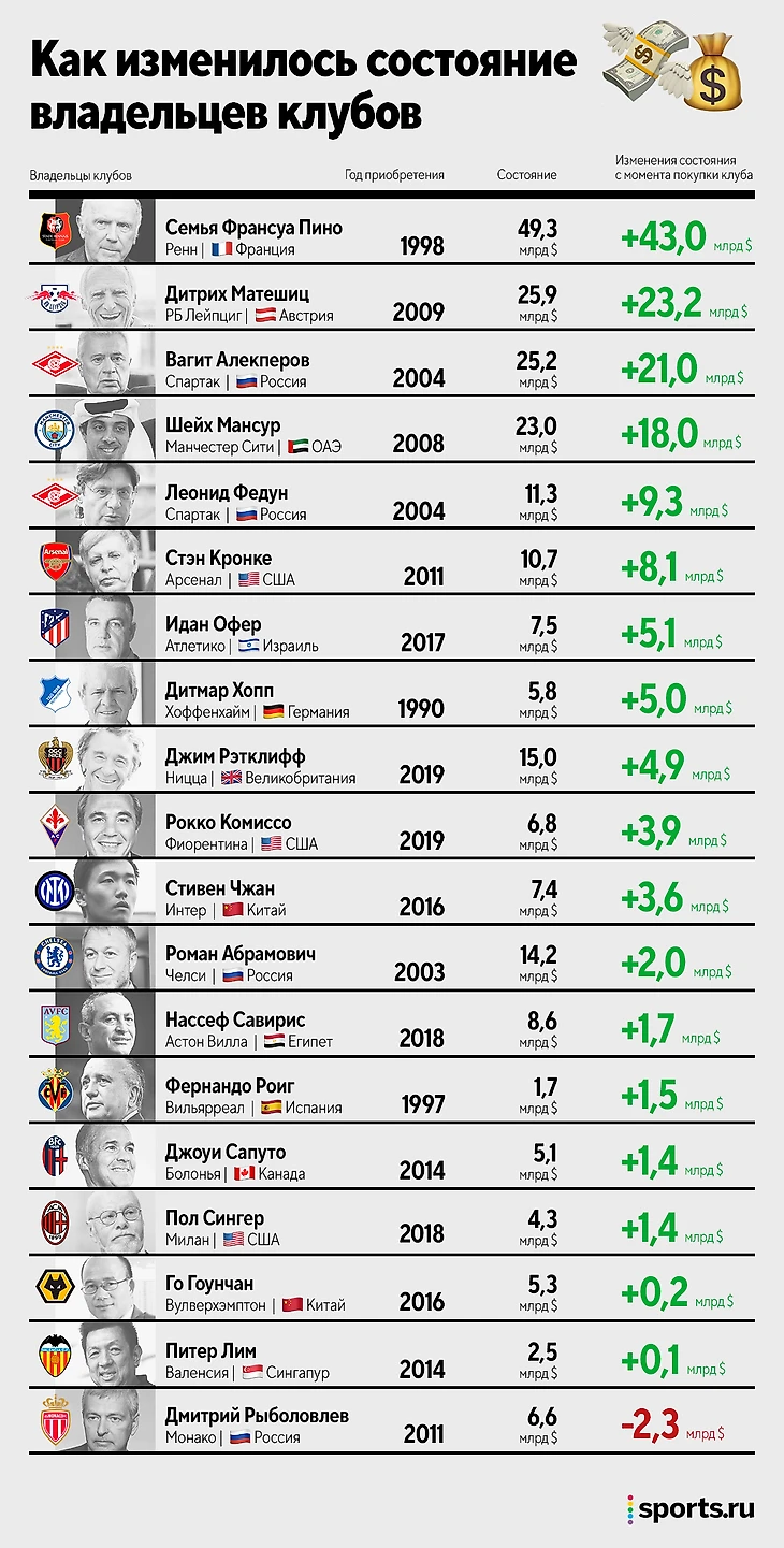 Давайте посмотрим на состояние бизнесменов после покупки клубов. Ниже – 17 наиболее богатых владельцев клубов из топ-5 европейских чемпионатов. Для сравнения добавляем в рейтинг совладельев «Спартака» – Вагита Алекперова и Леонида Федуна. Оцениваем изменения состояния по ежегодным рейтингам Forbes.