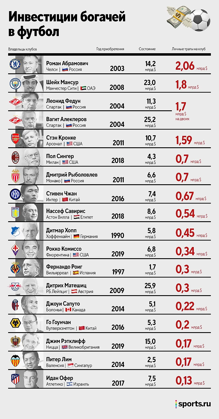 Футбольные клубы иногда называют дорогими игрушками сверхбогатых людей. Имеется в виду, что входной билет в мир владельцев из топ-лиг доступен лишь людям с состоянием от миллиарда долларов, которые не рассматривают клубы как бизнес-актив с серьезной прибылью. Более того, иногда они приносят убыток. Поэтому и считаются увлечением, которое не каждый может себе позволить.