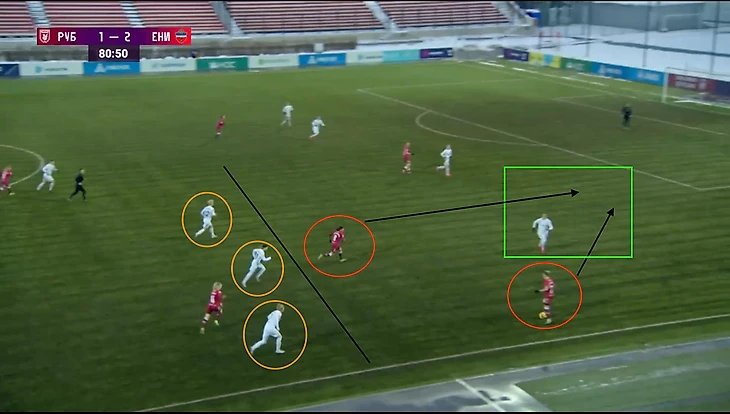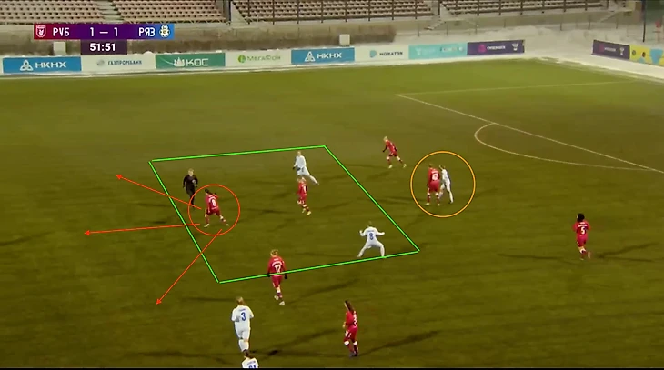 Собственно, и происходит вскрытие фланга, что заставляет центрального защитника выдвигаться на Котельникову и оставлять второго центрального и левого защитника в ситуации 2v2. Что при обороне не позволительно делать, так как, должно быть на одного человека больше. К сожалению, у Лианы не получилось довести момент до подачи, но сами движения были правильными и по футбольному обоснованными.