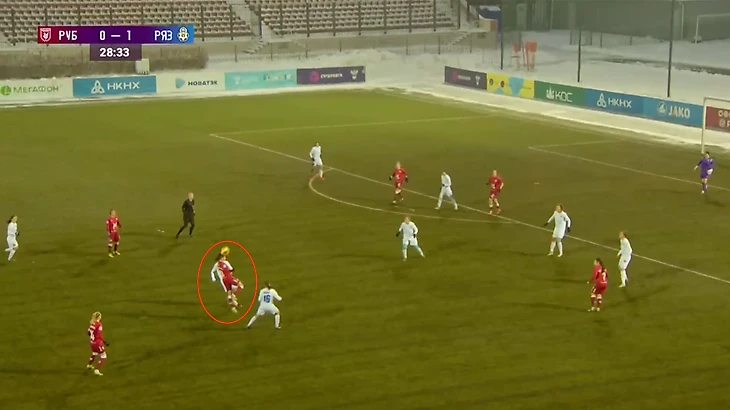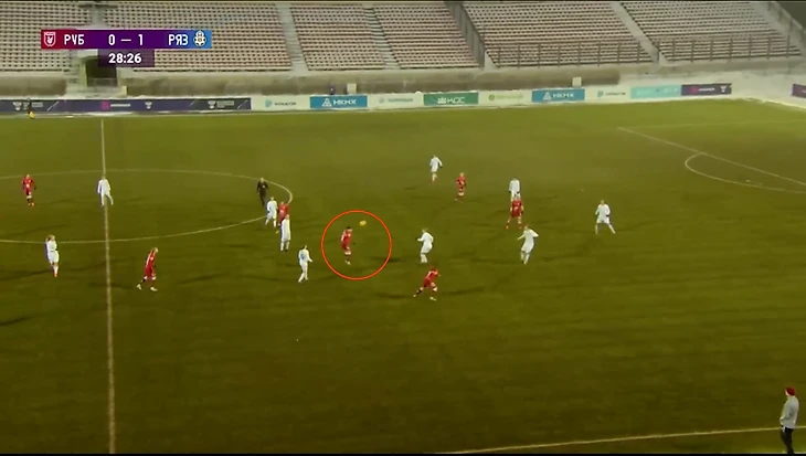 На первом скриншоте мы видим, что от центрального полузащитника "бордовых" идет передача на фланг. Лиана понимает, что ее окружают три игрока "Енисея". Поэтому она, сканируя пространство, видит свободную зону за спинами полузащитников команды соперниц и устремляется туда. Этим движением она отрезала от мяча сразу пять игроков.