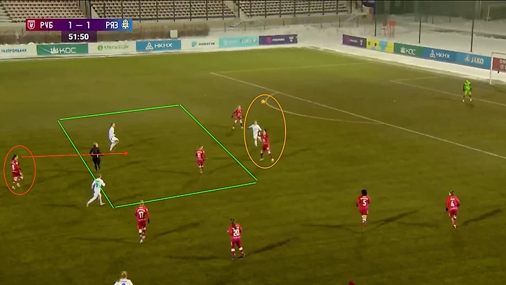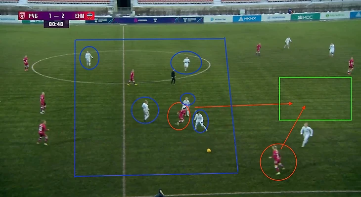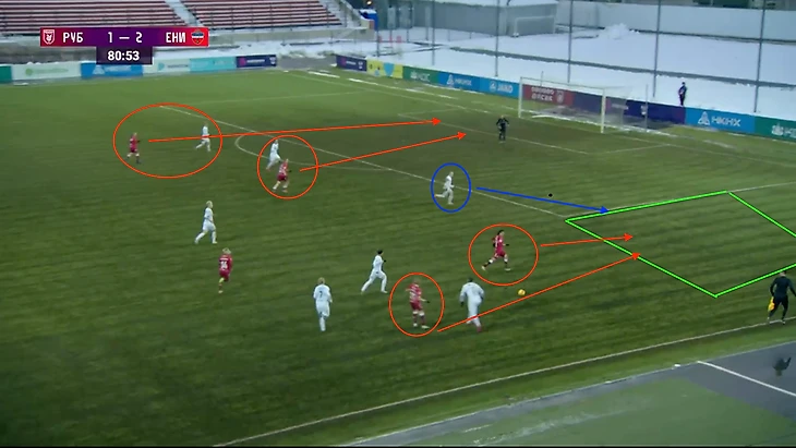 Продолжение первого эпизода. На скриншоте выше видно, что игроки «Енисея» вынуждены возвращаться назад лицом к своим воротам. Создается ситуация 2v1 на фланге, которая располагает к вскрытию "Рубином" обороны через полуфланг.